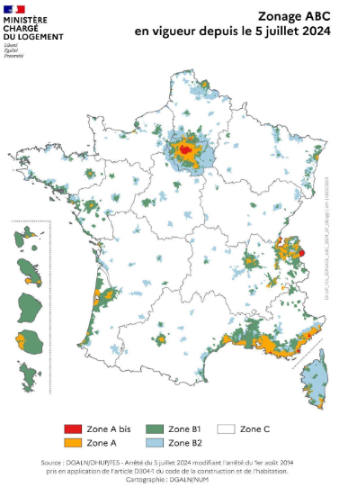 Le territoire français est découpé en 5 zones appelées A bis, A, B1, B2 et C et classées selon la tension du marché immobilier, c’est-à-dire le rapport entre la demande et l’offre de logements.